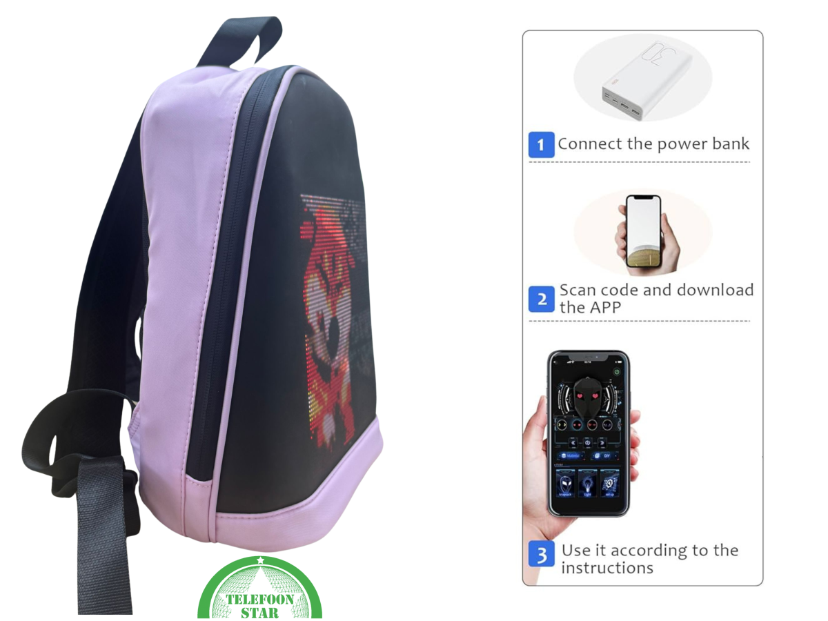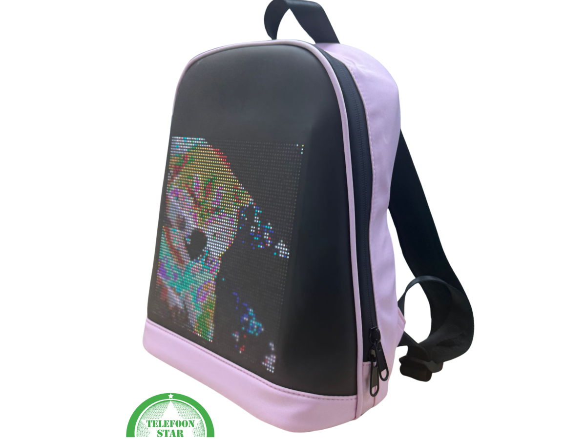 Deze stijlvolle roze rugzak heeft een geïntegreerd LED-scherm dat eenvoudig te bedienen is via Bluetooth. De tas is perfect voor studenten, reizigers, fietsers of iedereen die zijn creativiteit wil laten zien.