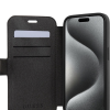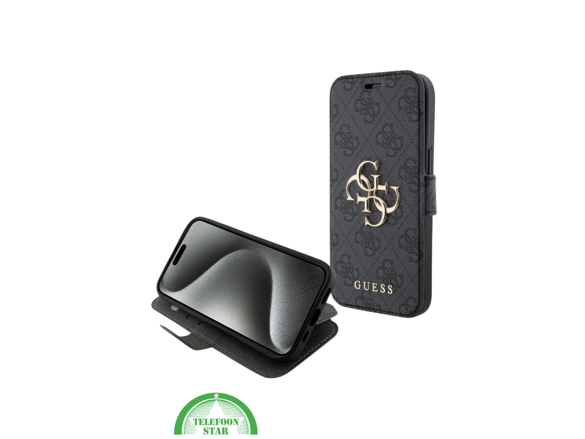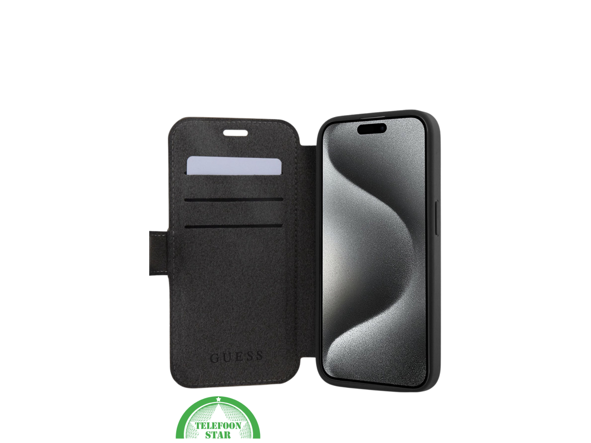 Combineer elegantie en functionaliteit met dit prachtige Zwart bookcase hoesje voor iPhone 15 Pro. Het hoesje biedt 360° bescherming en straalt luxe uit dankzij het verfijnde patroon en het goudkleurige logo op de voorkant. Perfect voor wie zijn toestel in stijl wil beschermen tegen krassen, stof en stoten.