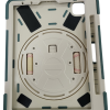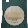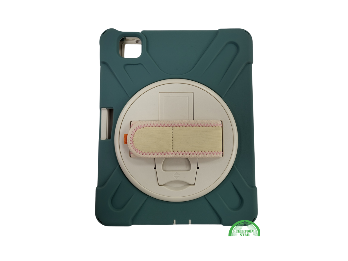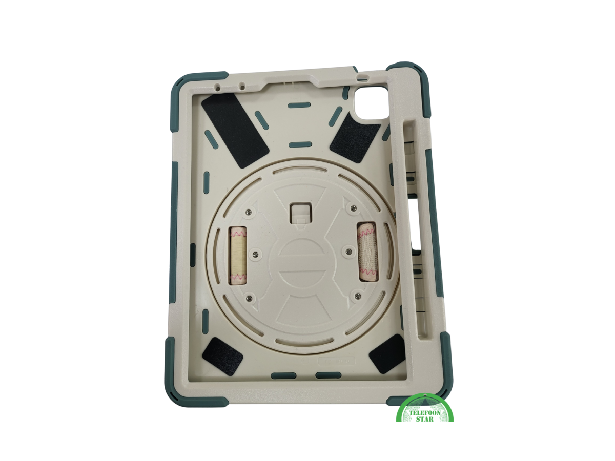 De buitenkant bestaat uit schokabsorberend TPU-materiaal met extra dikke hoeken om je iPad te beschermen bij vallen. De achterkant heeft een stevige, roterende handgreep/standaard waarmee je de iPad horizontaal en verticaal kunt neerzetten.