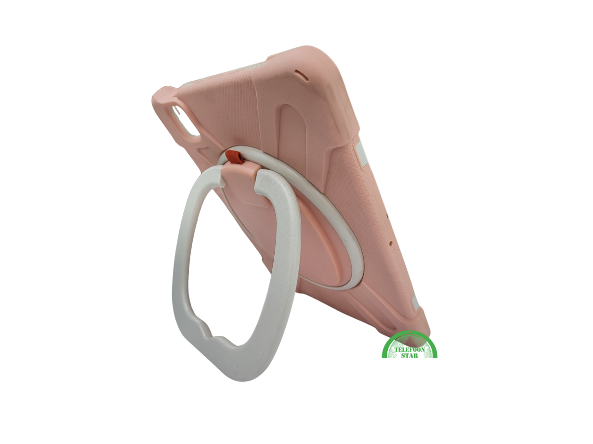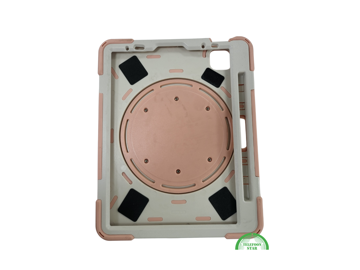 De buitenkant bestaat uit schokabsorberend TPU-materiaal met extra dikke hoeken om je iPad te beschermen bij vallen. De achterkant heeft een stevige, roterende handgreep/standaard waarmee je de iPad horizontaal en verticaal kunt neerzetten.