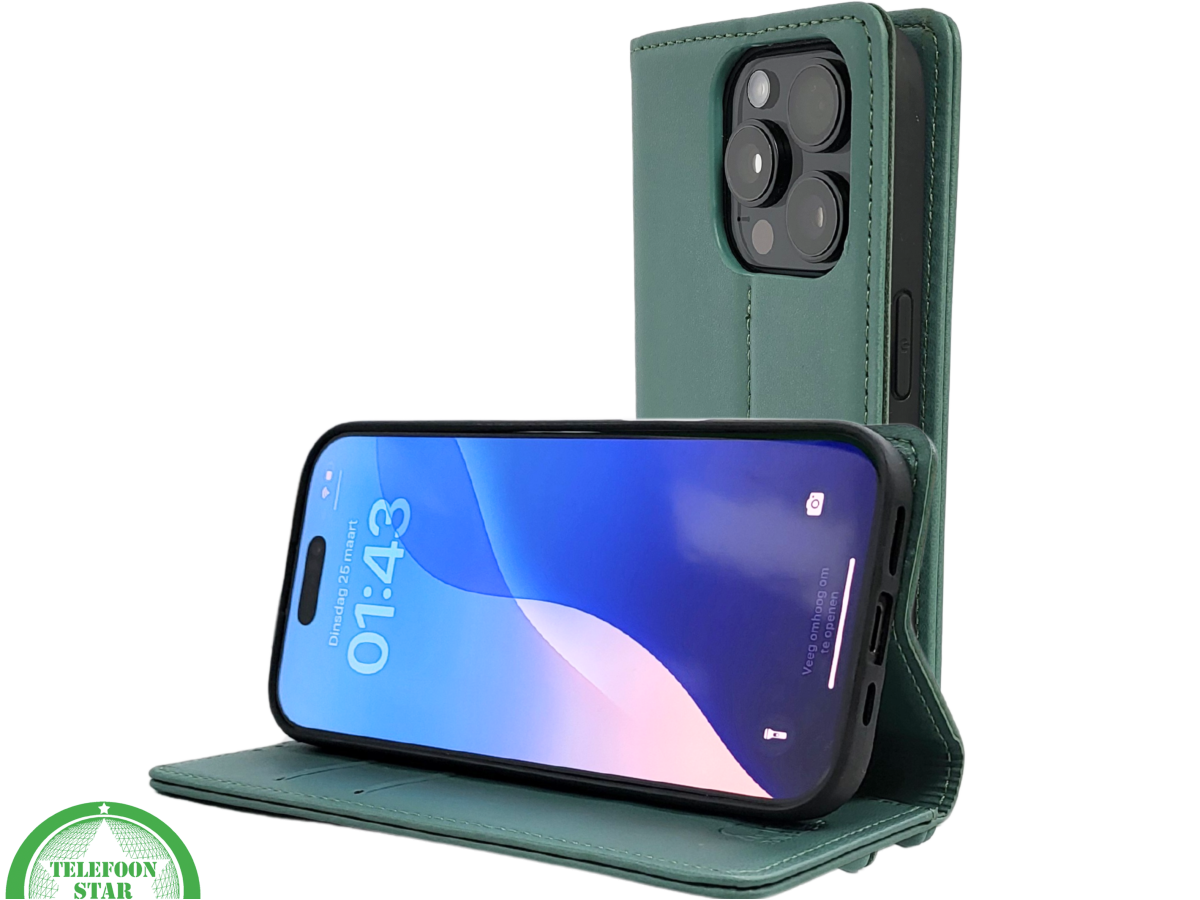 Past dit hoesje op de iPhone iPhone 16 Pro Max Bookcase Hoesje Donkergroen – Luxe Leren Look met Magnetische Sluiting?