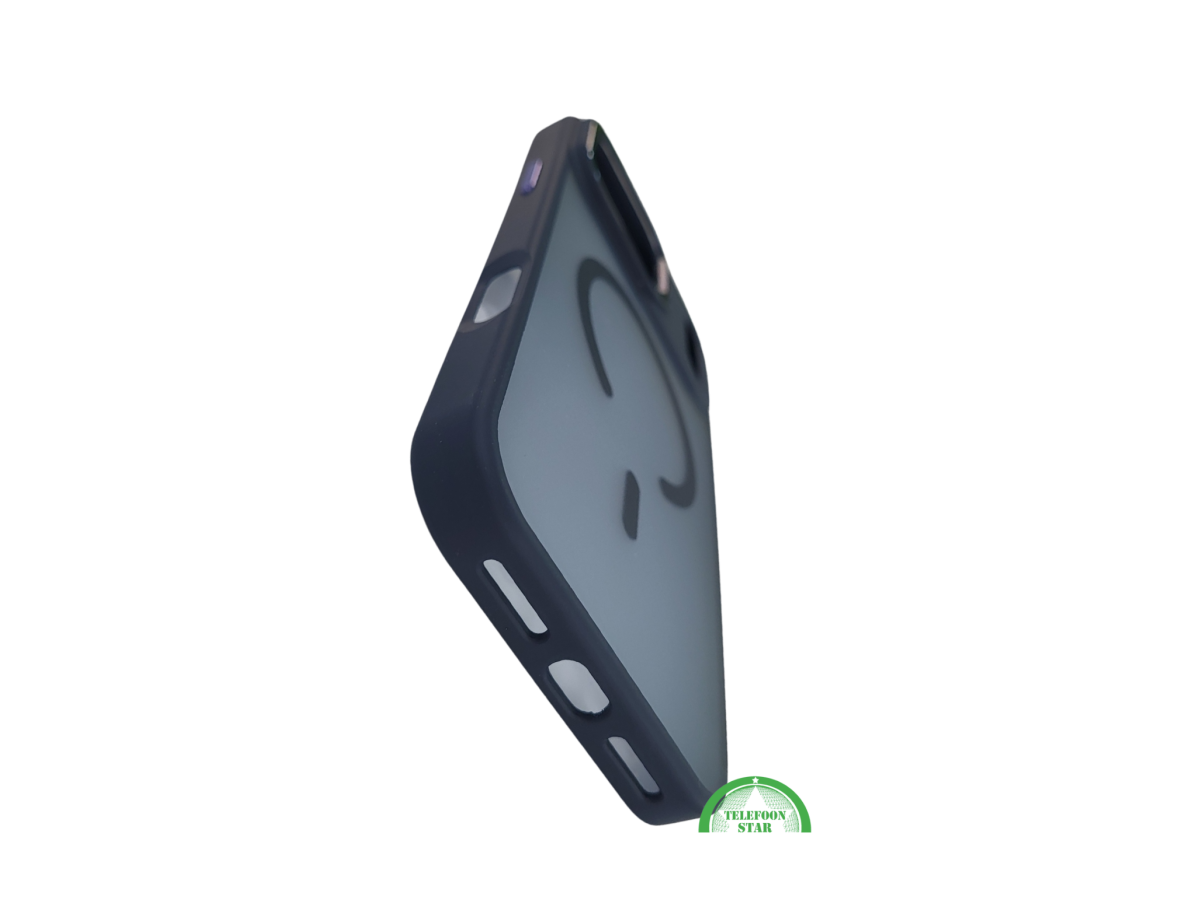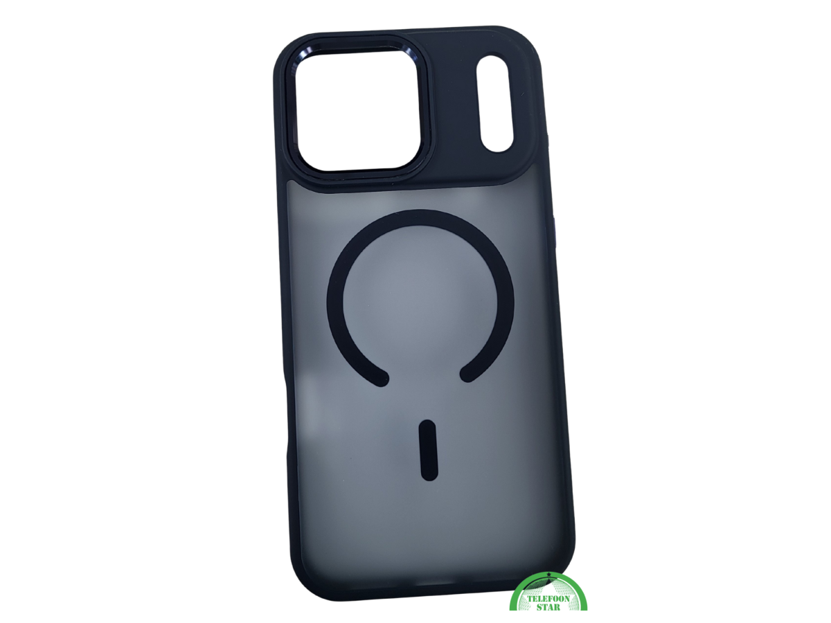 De achterkant is licht doorzichtig met een matte afwerking, zodat het design van jouw iPhone subtiel zichtbaar blijft, terwijl de randen en ring diepzwart zijn voor een stoere, luxe uitstraling.