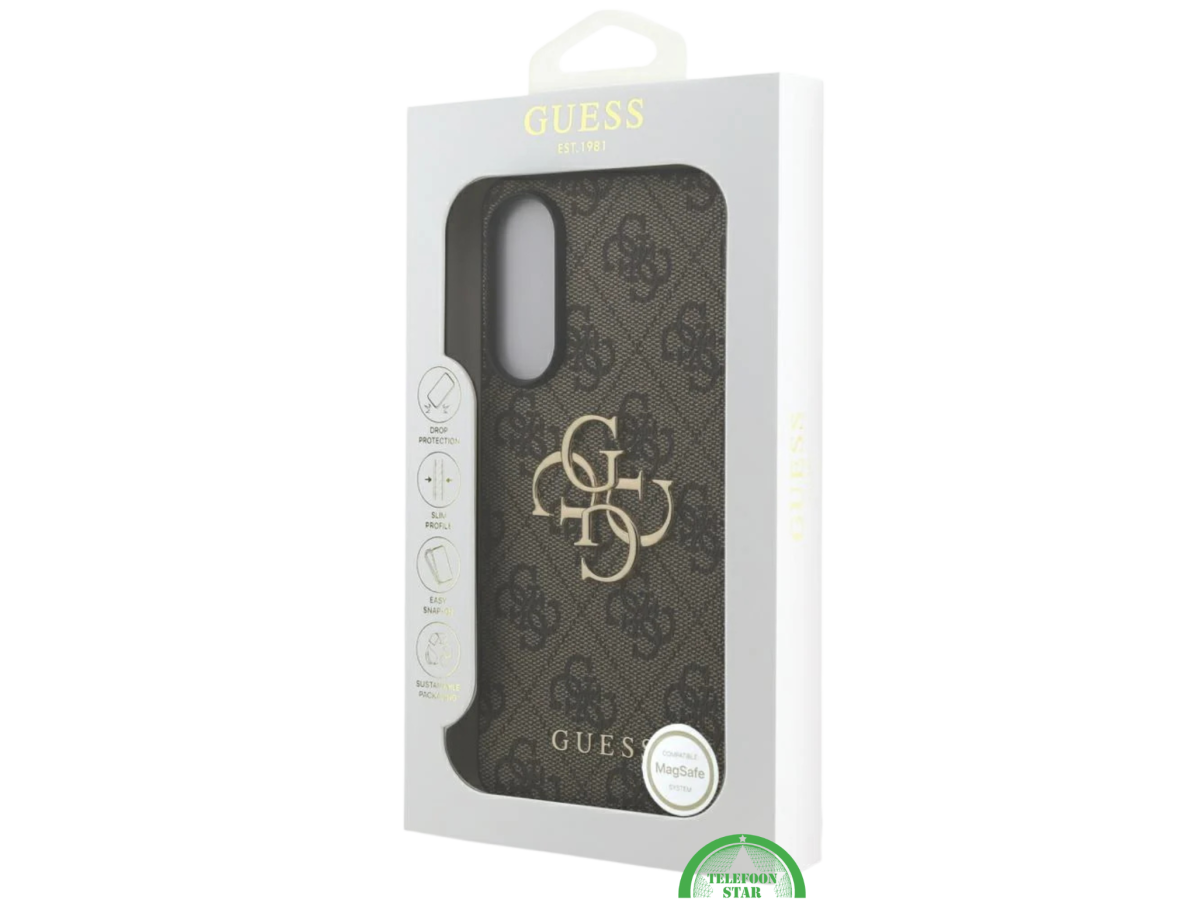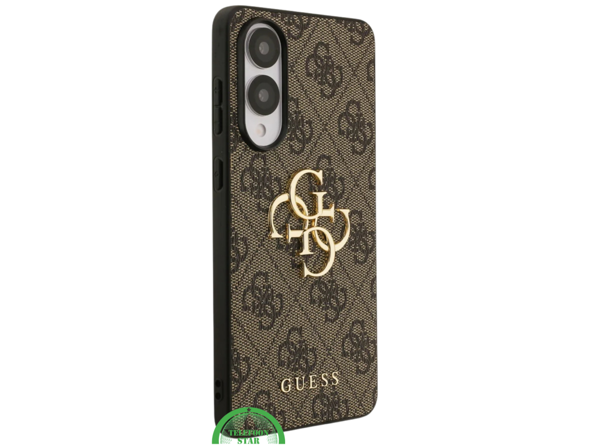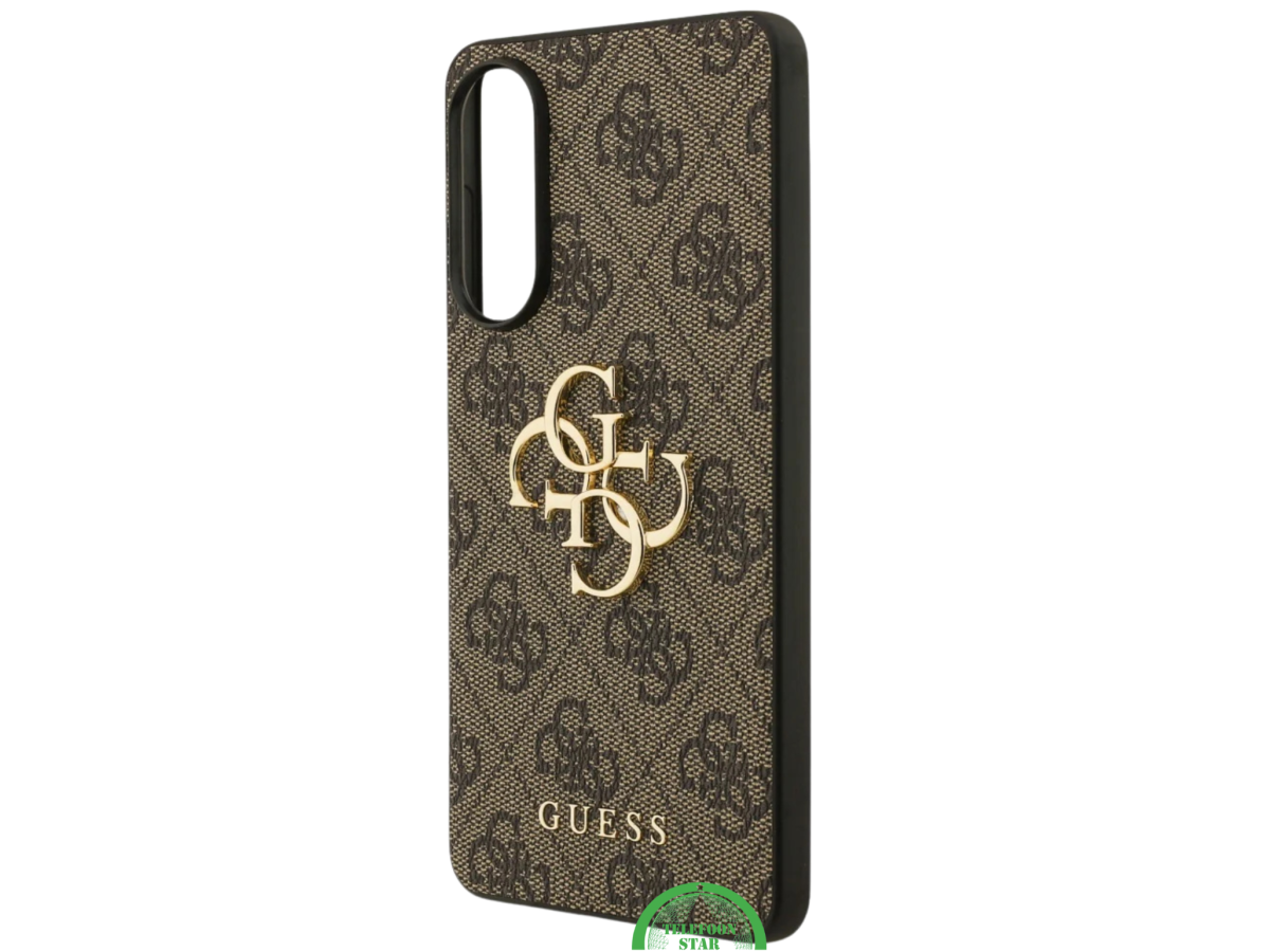 De achterkant heeft een stijlvolle lederlook structuur met een elegante gouden afwerking.